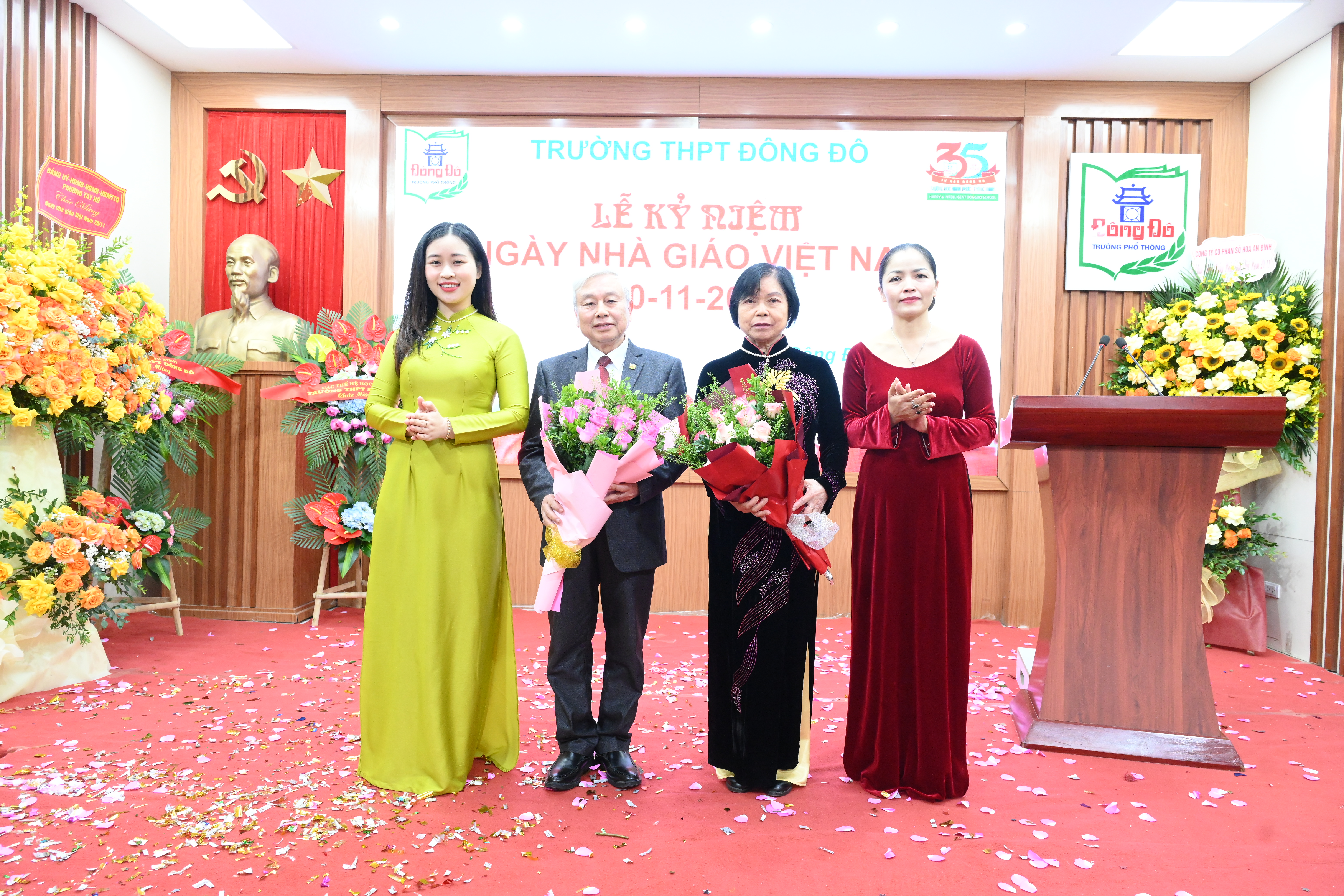 ThS Đặng Thị Hồng Thắm - Hiệu trưởng và ThS Lê Thị Hiền - Chủ tịch Công đoàn đại diện cho các thầy cô giáo tặng hoa chúc mừng TS Võ Thế Quân và TS Lưu Thị Khánh - nhà sáng lập và lãnh đạo trường THPT Đông Đô từ khi thành lập (1991) đến nay